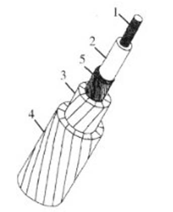 圖示:1、碳纖維環氧樹脂復合材料內芯;2、玻璃纖維增強環氧樹脂復合材料外芯;3、層梯形鋁導線;4、層梯形鋁導線;5、保護性涂層。