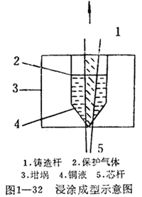 浸涂成型法生產(chǎn)無(wú)氧銅桿的原理來(lái)源于舊時(shí)沒(méi)涂制蠟技術(shù)。過(guò)程的實(shí)質(zhì)是,將一根相對(duì)較冷的芯桿,垂直高速通過(guò)一個(gè)盛有一定量銅液的石墨坩堝。由于芯桿吸熱、熔融銅水放熱而使熔銅沉積在芯桿上并自內(nèi)向外凝固。從而使芯桿增大(見(jiàn)圖1-32),溫度升高,得到浸涂后的鑄造桿。鑄造桿直徑與芯桿溫度、銅液溫度、坩堝中銅液面高度及芯桿速度有關(guān)。在這些因素不變情況下,鑄造桿直徑為一定值。